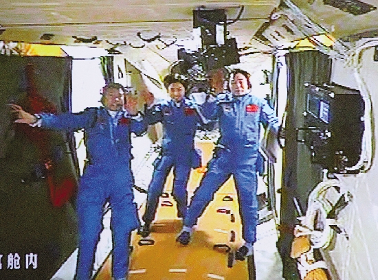 6月18日,神九航天员景海鹏、刘旺、刘洋在天宫一号实验舱内(视频截图)。 新华社发