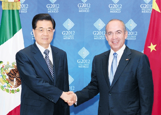 6月17日,国家主席胡锦涛在洛斯卡沃斯会见墨西哥总统卡尔德龙。 新华社记者 马占成 摄
