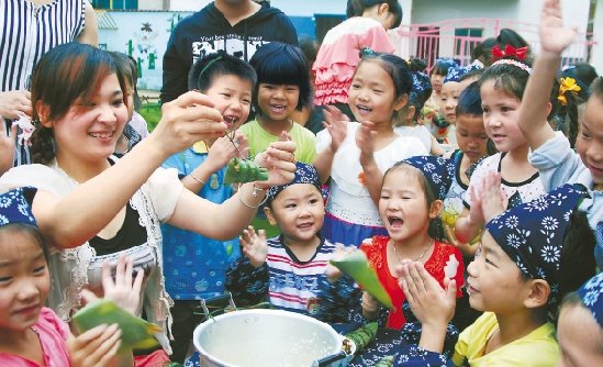 6月19日,建德市下涯中心幼儿园组织小朋友包粽子,迎接端午节。宁文武 摄