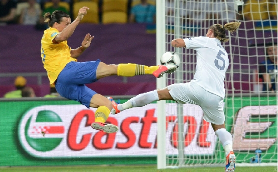 6月19日,瑞典队球员伊布拉希莫维奇(左)破门瞬间。 新华社发