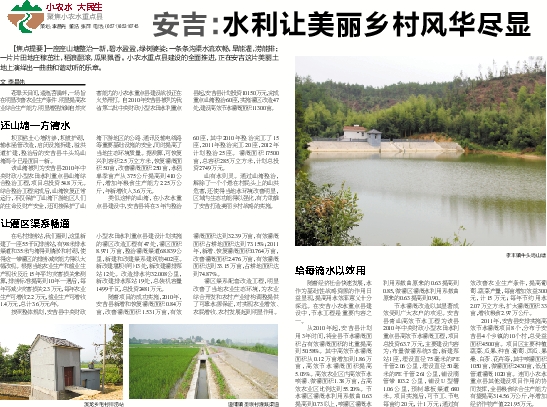【焦点提要】一座座山塘整治一新,碧水盈盈,绿树婆娑;一条条沟渠水流欢畅,旱能灌,涝能排;一片片田地庄稼茁壮,稻浪翻滚,瓜果飘香。小农水重点县建设的全面推进,正在安吉这片美丽土地上演绎出一曲曲和谐动听的乐章。