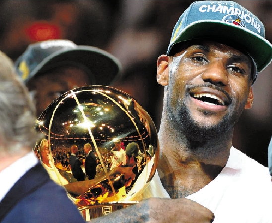 图为热火队球员詹姆斯怀抱总冠军奖杯。 新华社发