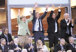 图为德国总理默克尔(上左一)、德国足协主席尼尔斯巴赫(上左二)等在比赛中欢呼德国队的进球。