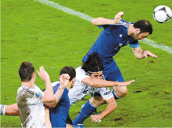 德国队球员赫迪拉(右二)在比赛中与希腊队球员托罗西迪斯争顶。