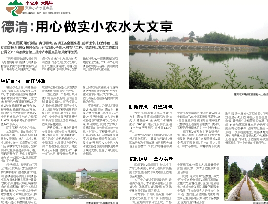 【焦点提要】组织到位,责任明确,各项任务全面推进;创新理念,打造特色,工程动态管理系统化;按时保质,全力以赴,争创水利精品工程。德清县以扎实工作成效获得2011年度我省第三批小农水重点县绩效考评优秀。