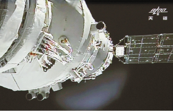 6月24日,北京航天飞控中心大屏幕显示,神舟九号与天宫一号再次形成组合体。 新华社记者 查春明 摄