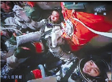 三位航天员举手庆贺。 新华社记者 王永卓 摄