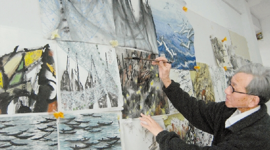 郭修琳在作画。 温岭日报记者 郭海波 摄