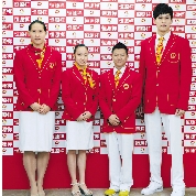 25日,出征伦敦奥运会的中国体育代表团礼仪服装在北京亮相。图为刘子歌(左一)、孙杨(右一)、陈一冰(右二)和黄秋爽身着礼服展示。新华社发