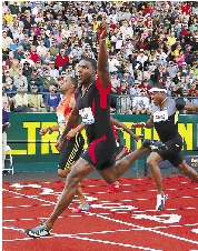 24日,加特林(中)率先冲过终点后举手庆祝。当日,在美国尤金举行的美国田径奥运选拔赛男子100米决赛中,加特林以9秒80的成绩夺冠。 新华社发