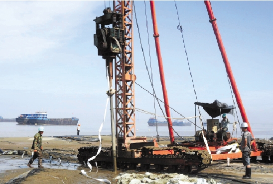 6月25日,一台陆上插排机正在舟山定海区金塘木岙集装箱物流基地围垦区进行排水板插打收尾作业。该基地项目将加快推进金塘综合物流岛开发。 姚峰 摄