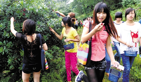 这几天,义乌赤岸镇下水碓、山盆、羊印等10多个村的5000亩杨梅相继成熟,吸引了大批游客前往采摘。 张建成 摄