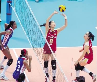 6月27日,中国队队员魏秋月(右二)在比赛中传球。当日,2012世界女排大奖赛总决赛在宁波北仑拉开战幕,中国队首轮3比0战胜古巴队。 新华社发