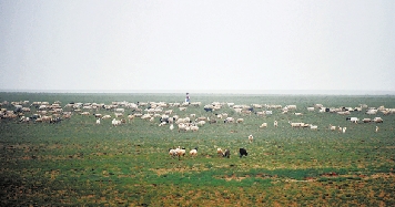 6月27日,牧人在雨中赶着羊群走过四子王旗脑木更苏木草原。