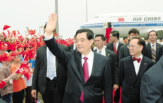 6月29日,胡锦涛主席在香港国际机场向欢迎人群挥手致意。 新华社记者 刘建生 摄