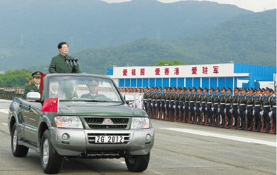 6月29日,中共中央总书记、国家主席、中央军委主席胡锦涛在香港石岗军营检阅中国人民解放军驻香港部队。 新华社记者 鞠鹏 摄