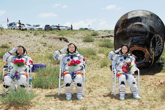6月29日,航天员景海鹏、刘旺、刘洋出舱后敬礼致意。