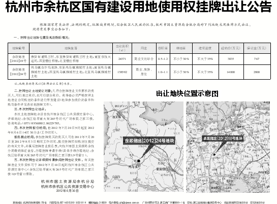 五、本次挂牌出让详细资料请参阅挂牌出让文件。有关挂牌出让文件资料可于2012年7月10日起到杭州市余杭区公共资源交易中心(余杭区临平南大街265号时代广场市民之家三楼)L9号窗口索取。