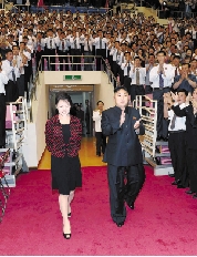 朝中社7月31日提供的照片显示,朝鲜最高领导人金正恩元帅(右)偕夫人李雪珠(左)观看牡丹峰乐团战胜节庆祝演出。 新华社发
