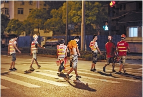 凌晨2点,杭州市上塘路高架桥下,劳动间隙,工人们穿过斑马线去吃夜宵。