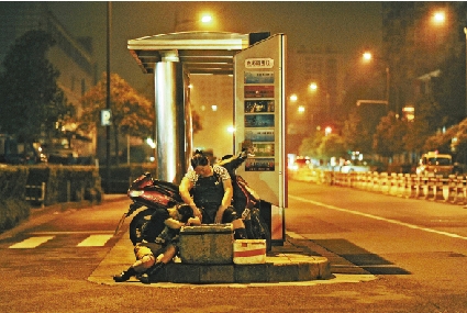 凌晨1点,杭州香积寺北路,两名洗车工人相依入梦。