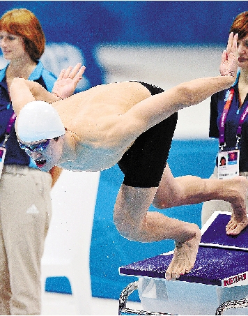 8月3日,中国选手孙杨在比赛后。当日,伦敦奥运会游泳男子1500米自由泳预赛在奥林匹克公园水上运动中心举行,孙杨以14分43秒25的成绩列预赛第一名,晋级决赛。 新华社发