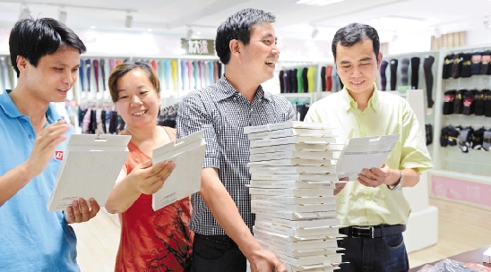 8月4日,上海客户来到诸暨大唐镇浙江东方缘针织有限公司提货,首批下单50万元。在针织产品外贸形势严峻的大背景下,东方缘公司开发压力袜系列产品开拓市场。 本报记者 黄曙林 诸暨日报记者 郭斌 摄