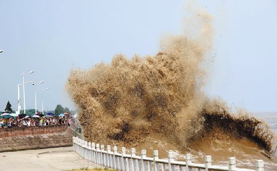 8月5日,农历六月十八,正值钱塘江大潮汛,钱塘江潮水十分汹涌。来自全国各地的游客在海宁老盐仓争睹汹涌的回头大潮。 本报记者 梁臻 魏志阳 摄