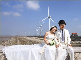 温岭箬横镇海塘边,新郎谢庭琛和新娘孟丽在海塘边拍婚纱照,海岸线成了一道美丽的风景,见证他们幸福的生活。
