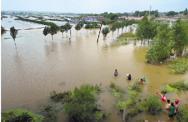 “达维”致辽宁受灾严重,创近年来台风最强纪录。图为8月5日,辽宁省庄河市一处村落遭受水灾,村民蹚水回家。 新华社发