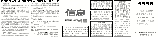 浙江广田装饰设计工程有限公司遗失一张开往浙江省一建建设集团有限公司的工程发票,遗失发票代码233001120243,发票号码00028468,发票金额274439,特声明作废。