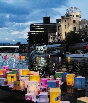 8月6日,在日本广岛原子弹爆炸遗址前,人们向河中放入纸灯追忆故人。当日,日本广岛举行了各种活动纪念遭原子弹轰炸67周年。