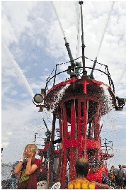 8月5日,在美国纽约哈德孙河上的一艘消防船上,一群孩子在消防水龙头下纳凉。刚摆脱热浪不久的纽约近日气温再次升高,已连续4天最高气温在30摄氏度以上。 新华社发