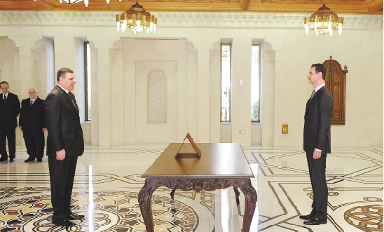 | 据叙利亚国家电视台2012年8月6日报道,叙利亚总理里亚德·法里德·希贾卜当天辞去总理职务。这是2012年6月26日在大马士革拍摄的里亚德·法里德·希贾卜(左)向叙利亚总统巴沙尔宣誓就任总理的资料照片。 新华社发 |