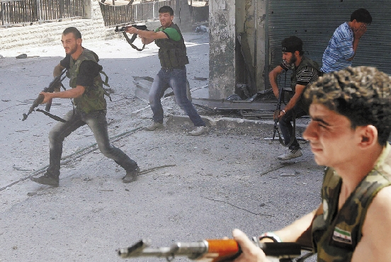 8月5日,在叙利亚阿勒颇地区,反政府武装人员向政府军射击。 新华社发