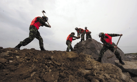 瑞安市公安边防大队官兵在飞云江口标准堤塘一缺口处,对零散堆放的泥石块进行整理加固,应对台风“海葵”可能带来的海水倒灌。 蔡宽元 摄