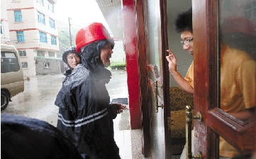 温岭市石塘镇新远景村的干部冒雨上门劝导群众转移。