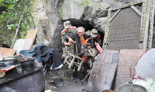 在台州市椒江海门街道东方红村,边防官兵将住在一洞穴里边的拾荒老人安全转移到避灾中心。 王天荣 摄