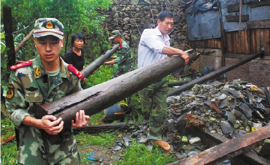 临海市桃渚边防派出所官兵与桃渚镇受灾群众一起清理倒塌房屋。台风“海葵”对临海市影响减小后,军民一起展开灾后自救。 周炜 摄
