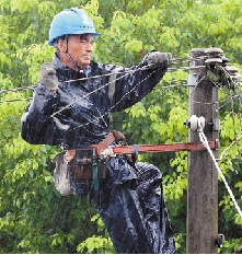 ②浙江海宁海州街道伊桥三组低压线路被树枝压断,当地供电局硖石供电营业所的抢修人员雨中上杆接线。 黄丹凤 张帆 摄