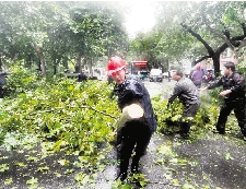 | 杭州南山路与万松岭路交叉口,园林工人给危树截枝排险。 尹炳炎 摄 |