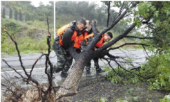 | 边防官兵在舟山清理被台风刮倒的绿化树。张振原 巴黎 谢国平 摄 |