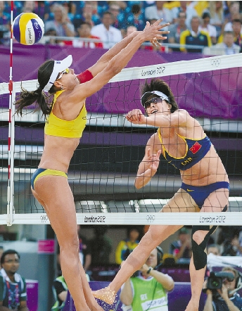 8月8日,张希(右)在比赛中进攻。 当日,在女子沙滩排球铜牌争夺战中,中国组合薛晨/张希以1比2不敌巴西组合,无缘奖牌。 新华社发