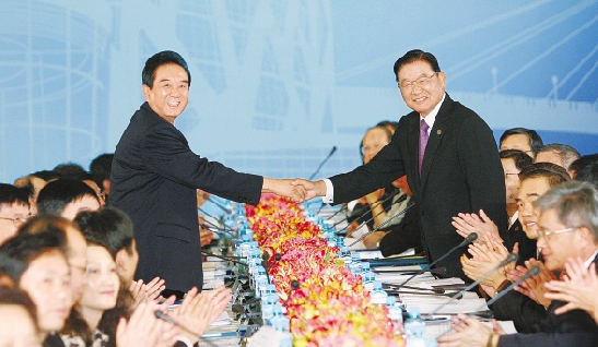 8月9日,海协会会长陈云林(左)与台湾海基会董事长江丙坤在会谈前握手。 新华社记者 侯东涛 摄