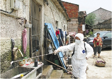 9日上午,缙云县疾控中心专业人员在东方镇洪涝灾害重灾区——岩腰工业区进行灾后防病工作。 县委报道组 朱映归 记者 于洪海 摄