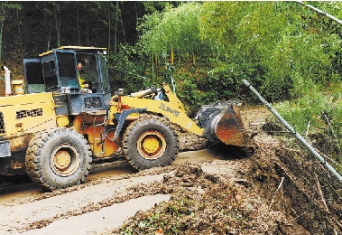 昨日,绍兴县公路管理段养护工人用铲车清理县道车谷线上的泥石流,经一个多小时作业,车辆恢复通行。 贺柏良 来建忠 摄