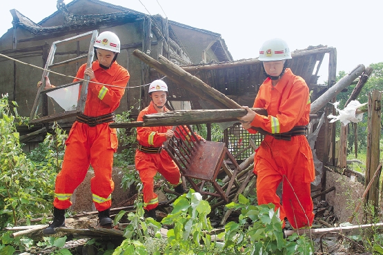 台风“海葵”过后,台州市开发区公安消防大队“消防雷锋班”立即行动,帮助群众重建家园。 何文斌 赵健 摄
