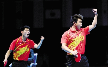 王皓(右)/张继科在双打比赛中庆祝得分。 新华社发
