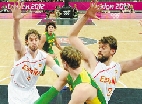 西班牙双胞胎篮球明星保罗·加索尔和马克·加索尔在男篮预赛中一起防守。
