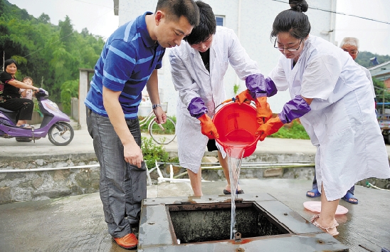 8月9日,舟山市防疫医生在定海区洞桥村向水井投放漂白粉液进行消毒。 舟山日报记者 胡社友 摄